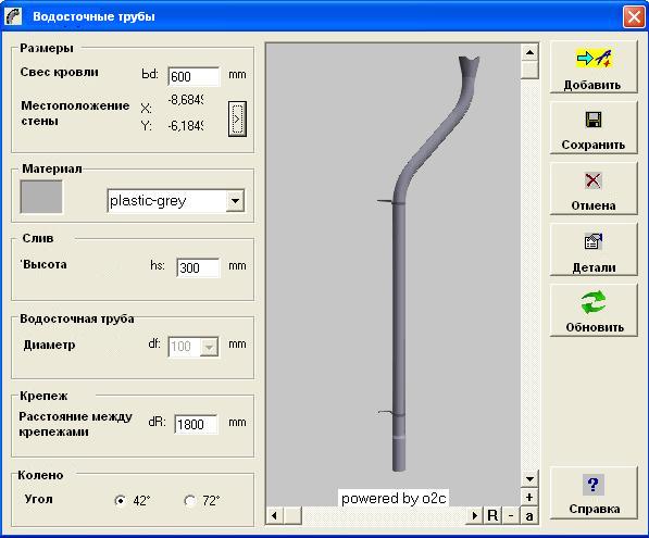 В окне Водосточная труба задаются необходимые параметры, а также материал трубы (пластик, цинк, алюминий или медь).